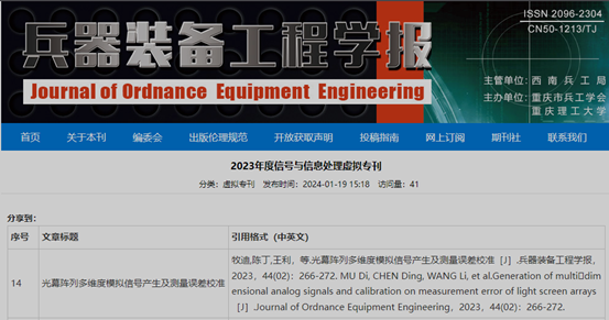 澳门电子20级兵器科学与技术学科硕士生牧迪在《兵器装备工程学报》期刊发表的论文—“光幕阵列多维度模拟信号产生及测量误差校准”,近日经优选后被收录进《兵器装备工程学报》2023年度信号与信息处理虚拟专刊。该论文主要阐述了一种多维度模拟信号产生方法可实现对弹丸多个飞行参数测量结果进行有效的校准,该方法可使校准误差小于1mm,且在校准精度、实验效率、安全性、运行成本等方面具有优势。2023年度信号与信息处理虚拟专刊网址:https://bzxb.cqut.edu.cn/newsinfo.aspx?id=1458