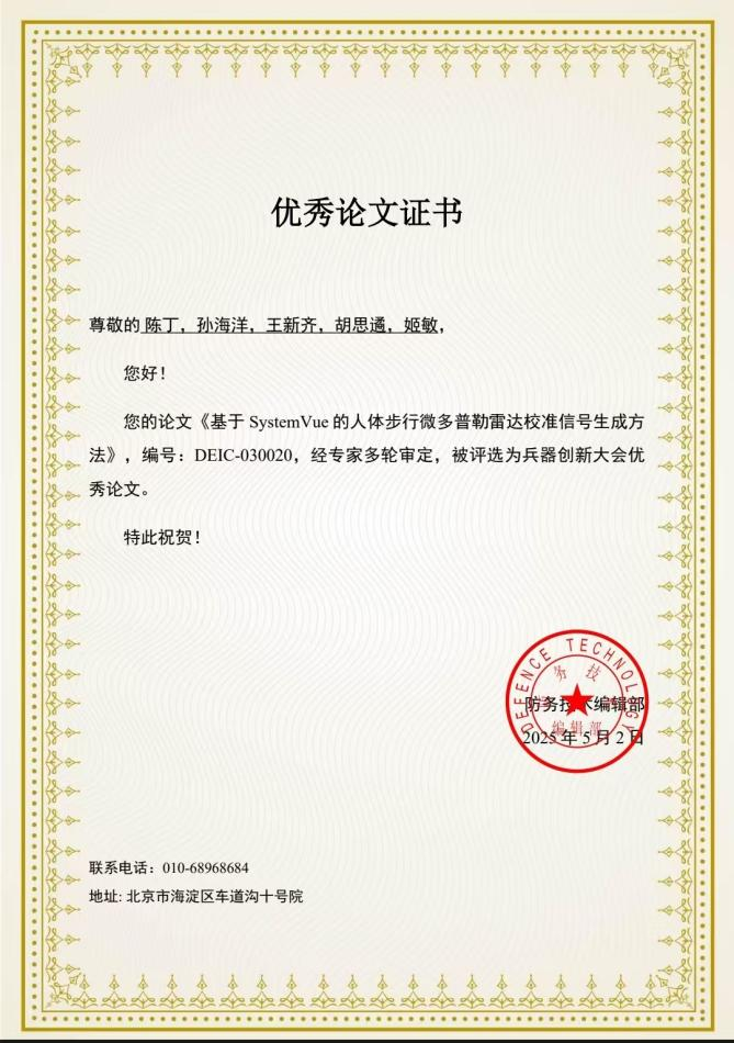 会后,经专家多轮审定,澳门电子23级兵器科学与技术学科硕士研究生孙海洋(第二作者兼通讯作者)撰写的《基于SystemVue的人体步行微多普勒雷达校准信号生成方法》,被评选为兵器创新大会优秀论文。