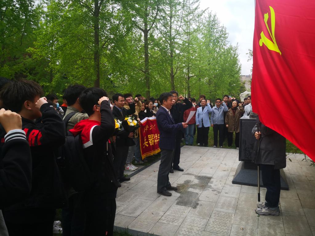 最后,全体党员在马保吉书记的带领下重温入党誓词,洪亮的声音经久不息。副院长蔡长龙与党员代表于佳洋为吴运铎献上鲜花。