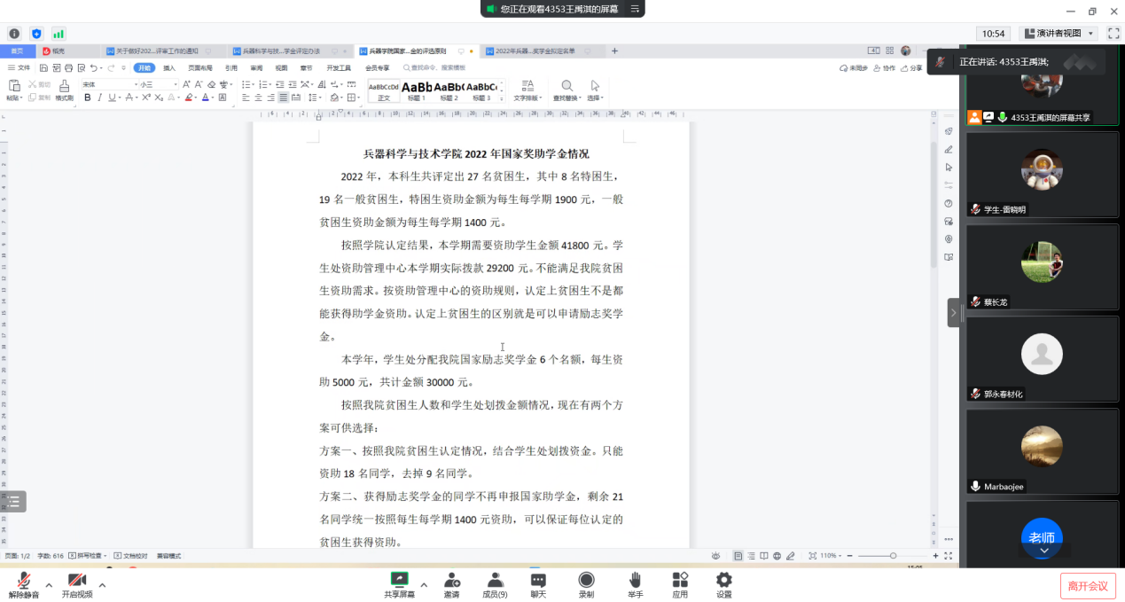 2022年11月4日下午,澳门电子pg游戏官网召开学院奖助委员线上会议,研究并讨论本科生国家助学金和国家奖学金评审原则、普瑞斯企业奖学金评定办法。评审委员会成员马保吉、郭永春、蔡长龙、王春阳、吴杰、霍文俊参与了评审委员会。辅导员王国栋,本科生研究生各一名代表参加了会议,会议由党委书记马保吉主持。